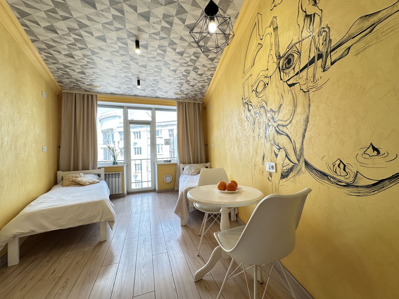 Cozy hostel in the center of Kharkov. English-speaking staff, inscriptions are duplicated in English. Spacious bright rooms for 2 people, beds with a comfortable mattress are closed with curtains.